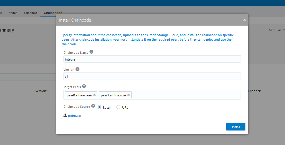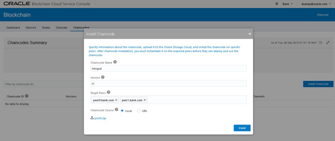 最后还需要在各个加盟商独立的管理控制台,安装链码。由于甲骨文区块链云服务对链码实例化针对特定通道实例化,不是针对组织或对等节点的,一旦链码在组织方被安装,不需要再实例化。