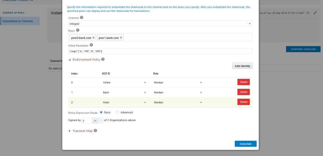 在组织者管理控制台安装完Chain Code后,需要实例化链码,点击“实例化链码”,配置通道信息,选择Peer节点,以及配置背书策略