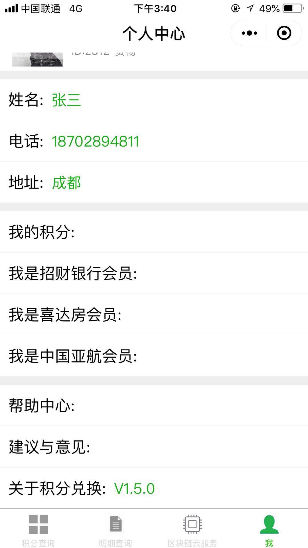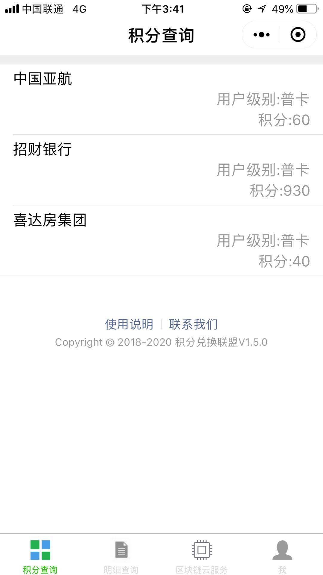 积分查询:通过后台区块链的分布式账簿,查询当前用户在各个加盟商(航空公司,银行)的剩余积分。
