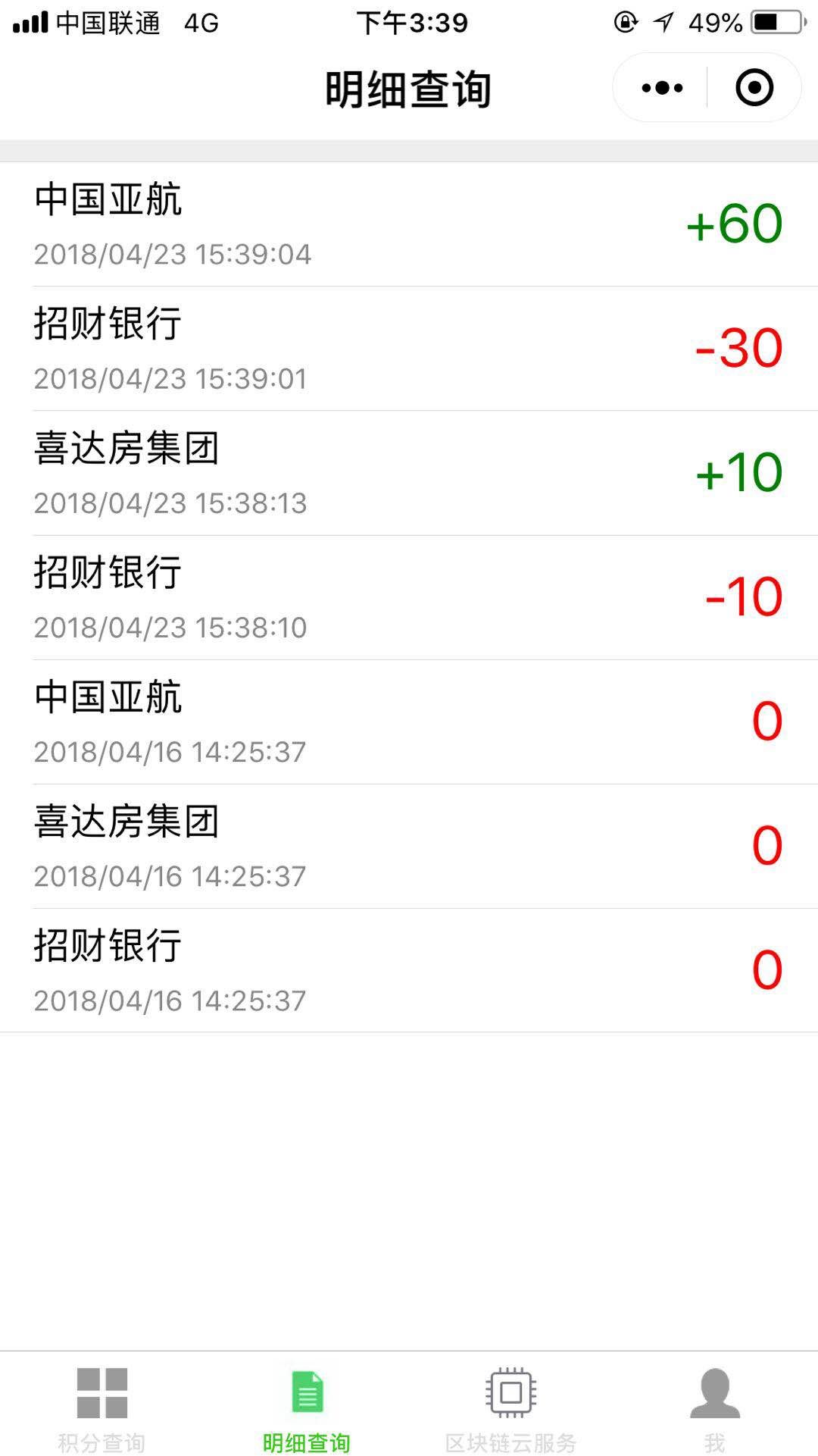 明细查询:由于所有的积分兑换交易信息都存储在区块中,可以方便的查询该用户所有积分兑换的明细记录。