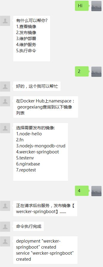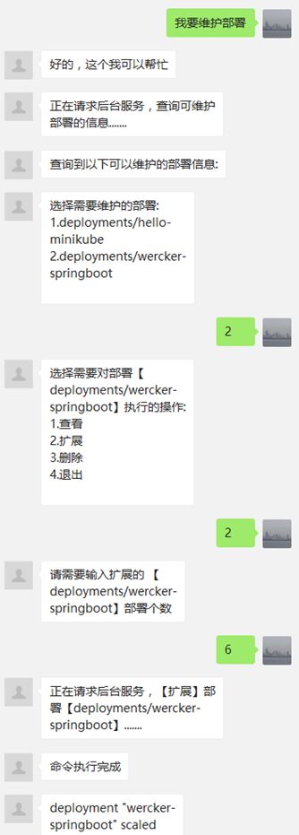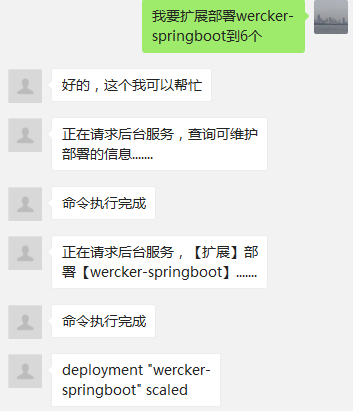 直接输入“我要扩展部署wercker-springboot到6个”,Chatbot能够识别要对部署进行维护的意图,同时提取实体wercker-springboot作为deployment的名称,以及实体数字“6”,作为扩展的个数。