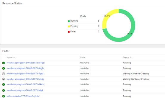 通过查询Kubernetes dashboard,6个wrecker-springboot pod 扩展成功,其中两个pod正在创建当中。