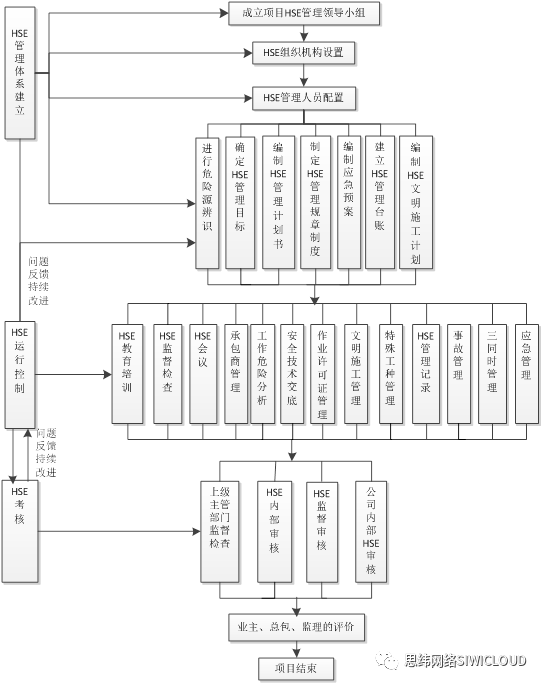 HSE管理主要进行从项目立项至验收阶段的全过程危险预防与管理措施的审查工作,确保工程项目本质安全。通过强化施工现场的HSE管理,及时消除各种隐患,为项目周围环境、项目参建人员的人身安全及健康提供保障。HSE管理主要包括:安全检查、安全整改、整改执行情况、统计分析、形成新的管理规定等闭环管理过程。