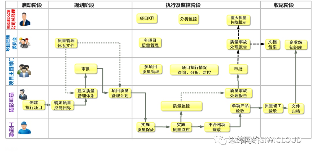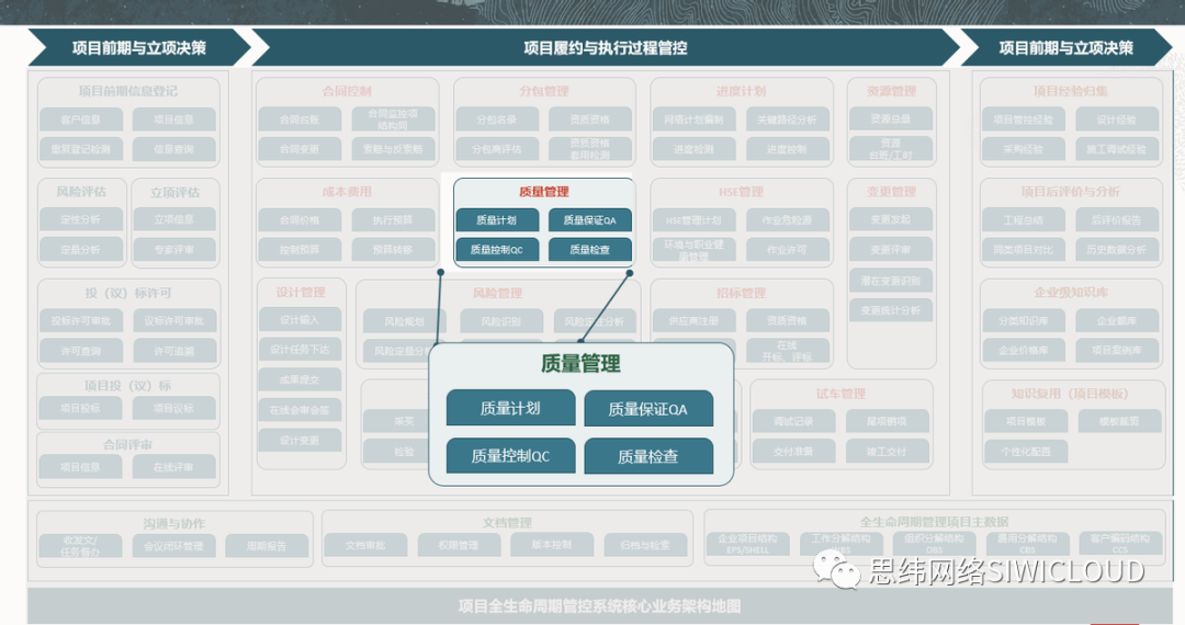 包括质量管理策划、质量管理体系、过程质量管理、专业质量管理、质量监察和质量监督、统计分析等主要工作内容,实现对质量管理活动进行全过程的管理。为各个项目的质量管理提供统一的规范、标准和体系文件。保证公司的质量管理体系在各个职能部门和项目部的执行。同时汇总各个项目的质量管理数据,进行查询统计分析。