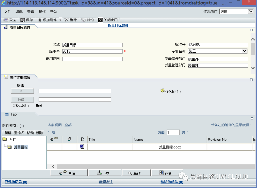 从知识库、合同模块收集到项目质量目标,根据收集的项目质量目标以及公司要求编制项目质量标准,通过内部审核后,将编制审核完成的项目质量标准发布到文档模块。