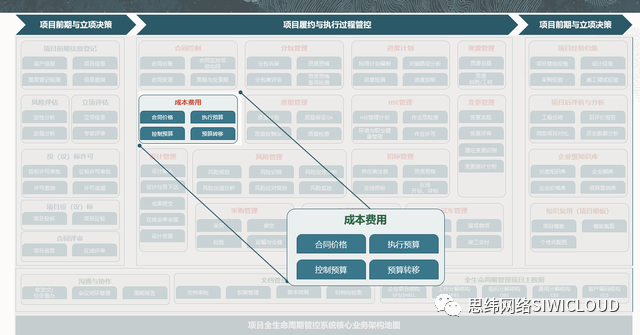 成本费用管理模块功能分为公司级、项目级两个层级,其中公司级功能包括概预算管理、概预算定额管理、预算模板管理,以及控制估算管理等功能;项目级功能包括变更管理、请款管理、收付款管理等;并设置成本归集及分析模块,对实际的业务数据进行归总、分析,为项目管理层、区域总部项目管理、公司决策层提供管理依据和支持。