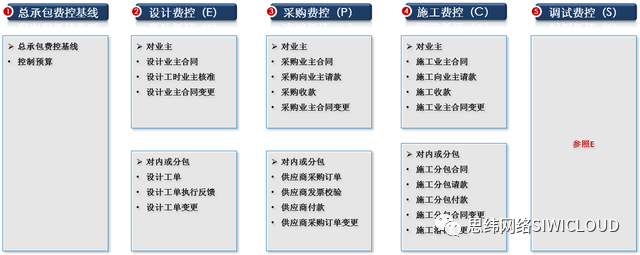 成本费用管理主要是为了合理利用资金资源,控制企业的成本费用,国内外工程公司通用的成本费用控制方法论如右图所示。针对工程公司客户的需求,并结合工程公司系统中费用控制模块的功能,将项目成本费用控制系统分为概预算管理、控制估算管理、成本收集与分析模块、成本归集及竣工决算模块,并与合同模块紧密结合,将请款、付款的业务与合同管理相结合,共设有合同价格、执行预算、控制预算和预算转移四个子模块。