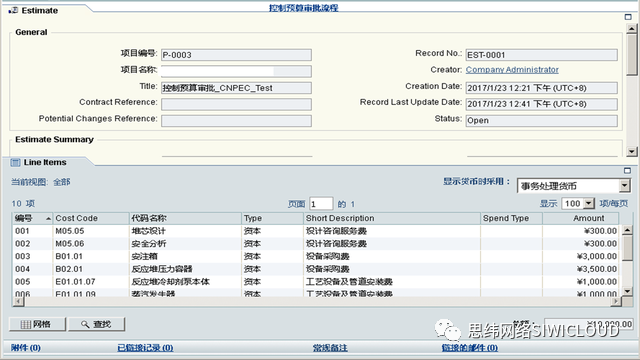 本系统中与WBS关联的Cost Code作为控制预算的明细项清单来源,控制预算是对总承包合同的估算。当需要对估算进行调整时,需要对控制预算进行变更,控制预算的明细项也可以发生估算转移。控制预算、控制预算变更所发生的费用都将自动反映到Cost Sheet,即在承包合同执行期,能实时根据费用科目类型,进行费用对比。