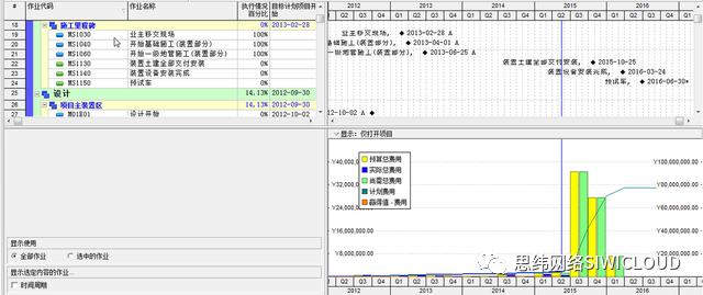 对于项目高级管理层,在项目初期阶段,需要他们确定项目大的里程碑计划或WBS等级计划,所以提供给项目高级管理层这样一种简单快捷的工具是必要的。软件就有这样一个专门为项目高级管理层设计的功能,它不但能方便编制出高层进度计划,而且也能对项目群组、项目的进展状况进行分析,为决策者提供及时、有价值的分析数据。如下图。