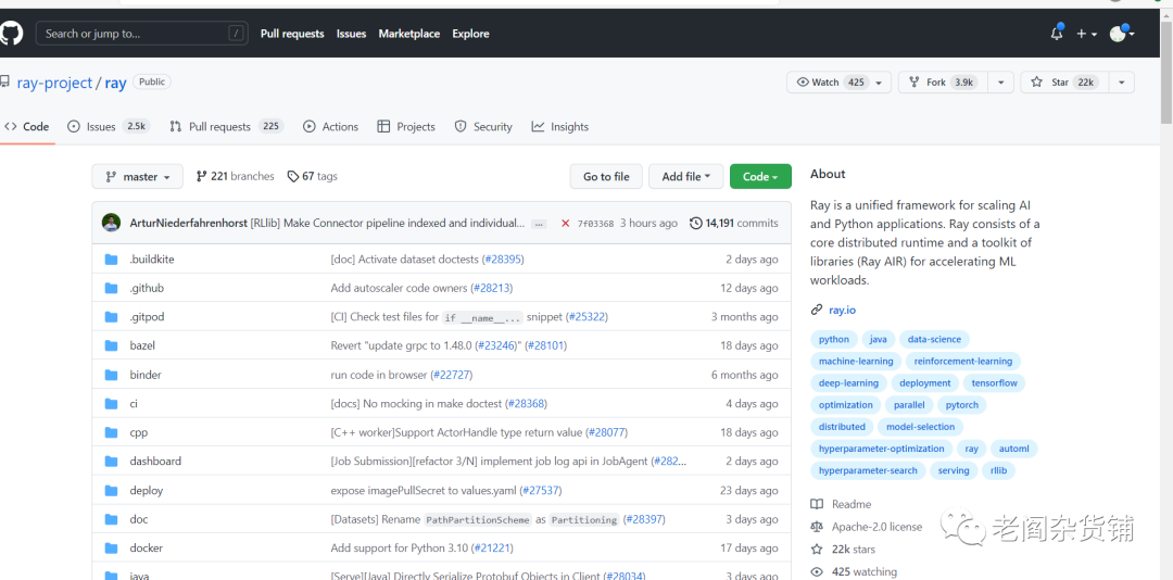 我们可以看到Ray现在已经有2万2千个star,有3900个左右的fork。从这个数据看,Ray无论如何属于在开源社区中的一个非常热门的项目了。在AI运行时这个领域,我相信Ray应该是最普及的开源项目了。