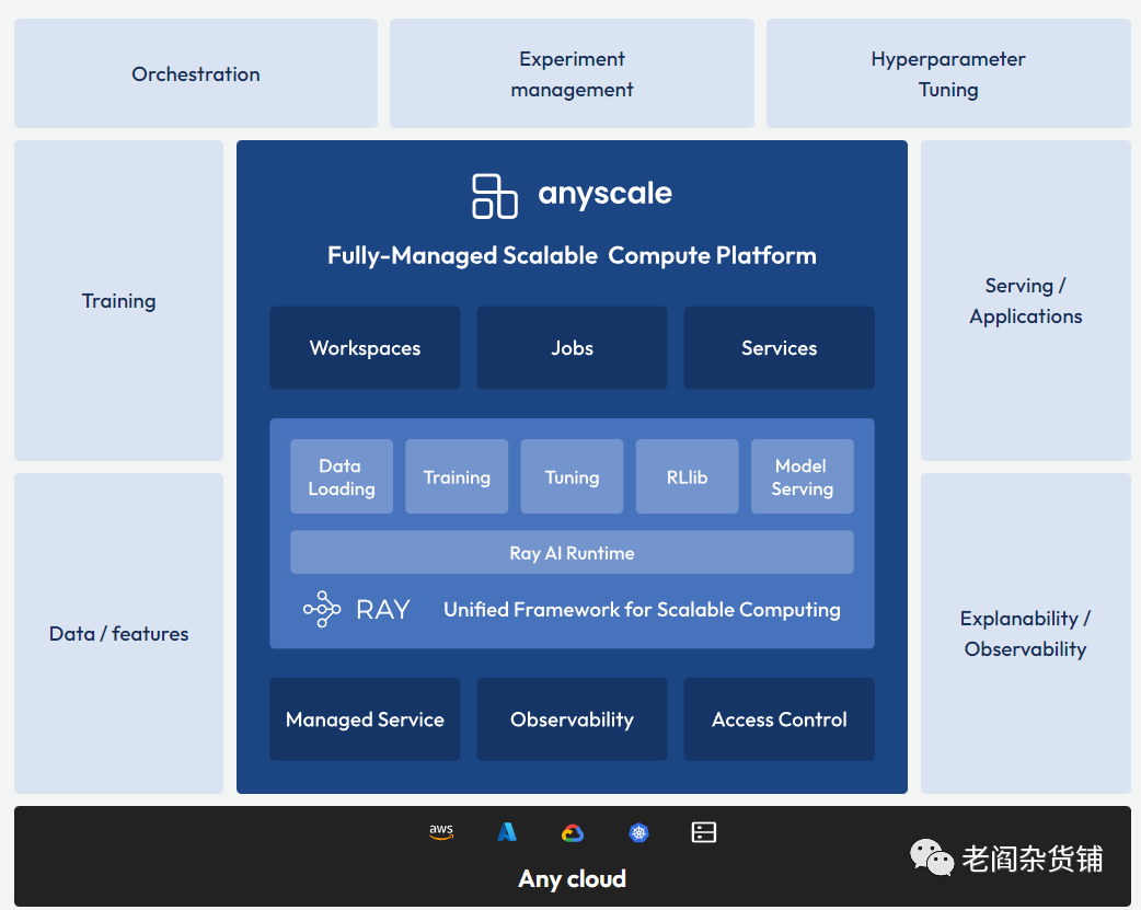 Anyscale是在跨公有云的Ray的服务公司,利用Anyscale提供的公有云服务,用户不需要自己去维护管理一套Ray的服务。只需要把机器学习模型按照Ray的开发规范进行开发后,就可以在Anyscale的服务中去调度和执行。对于普通的企业用户来讲,可以大大节省人员维护系统的开销。