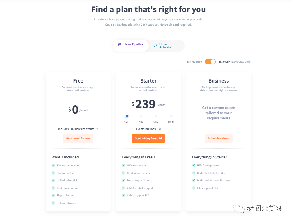 Hevo Pipeline主要是面向的数据集成,Heva Activate则是反向ETL。我们这里主要看看Hevo Pipeline的定价。