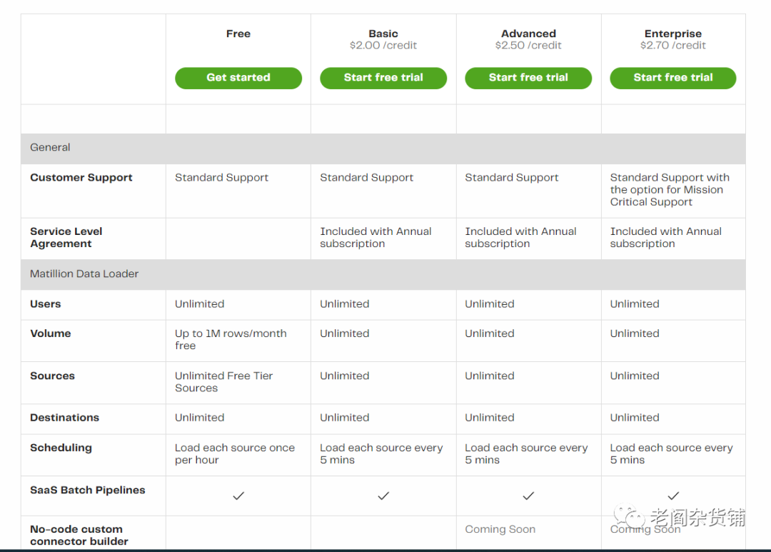 我们可以看到,与HevoData类似,Matillion也有免费套餐。免费套餐的量是100万条以下。Matillion的付费套餐则采用了购买credit的方式。基础版本的credit为2美金一个credit,高级版本为2.5美金,企业版本则为2.7美金。不同的版本,在支持的功能上有一定的区别。但是主要的区别在于Matillion ETL的功能区别,如果仅仅使用Matillion Data Loader,则功能差别不大。Matillion收费的版本中,如果只使用Matillion Data Loader,每个credit能够处理的数据条数根据数据量不同而不同。每月低于500万记录的时候每个credit能集成20000条,后边分不同的阶梯,到每个月10亿条数据的时候,则每个credit能处理1000万条记录。