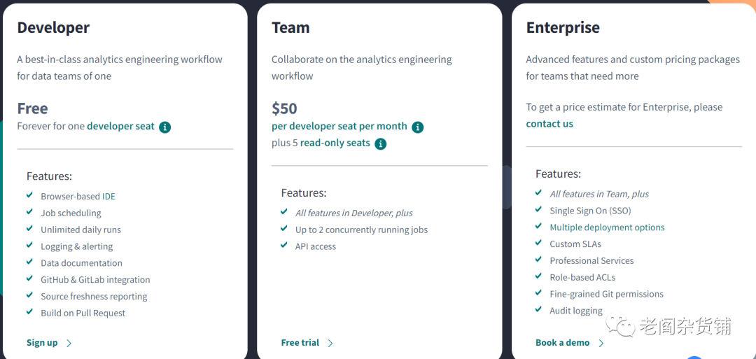 跟所有的SaaS产品一样,dbt的企业版则需要单独跟销售进行沟通,获取定价了。
