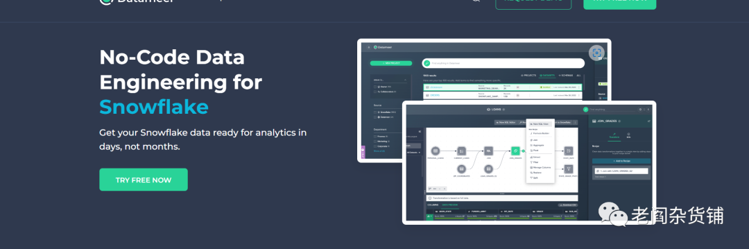 Datameer是另外一个数据建模和转换的平台。与dbt不同的是,datameer专门针对snowflake,可以说抱紧了snowflake的大腿。