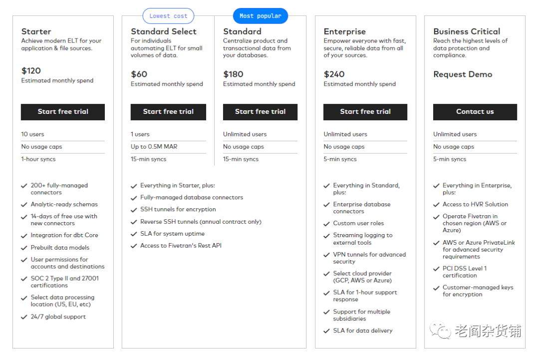 Fivetran在试用结束后,就需要付费使用了,具体的价格计划如下: