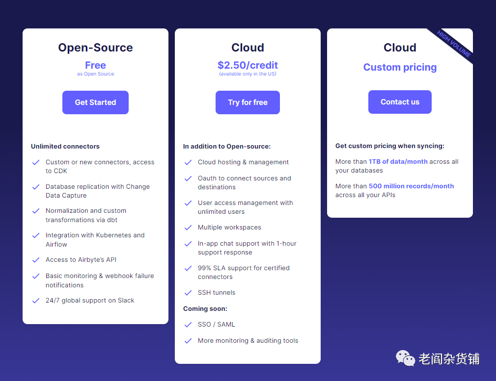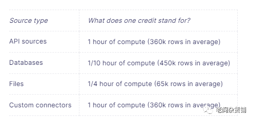 AirByte是开源的数据集成产品。因为是开源,因此AirByte让客户可以自己实现针对自己数据源的数据连接器。从数据连接器方面,AirByte比Fivetran可以支持更多的数据源。不过由于AirByte成立的时间远远晚于Fivetran,因此很多连接器还处于测试阶段。作为开源产品,企业客户可以自己安装、部署Airbyte来实现数据集成。不过对于中小型企业来讲,自己维护一个数据集成服务并不是一个合适的选择。Airbyte也提供基于公有云的版本,公有云的收费价格体系与Fivetran有一定的区别。在公有云上,只有两种价格方案可以选择: