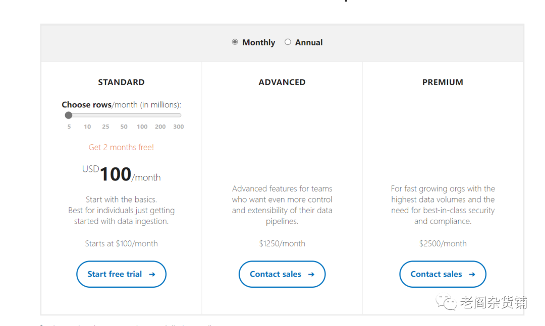 StitchData也支持免费试用,但是试用结束后的最初的版本价格为100美金每个月,使用量为500万行。从这个定价看,Stitch更适合数据同步规模比较大的用户,规模比较大的时候,stitch同步一条数据的价格比Fivetran低,但是比AirByte更高。但是如果中小企业,每月同步的数据量比较小,Stitch不是一个合适的选择。