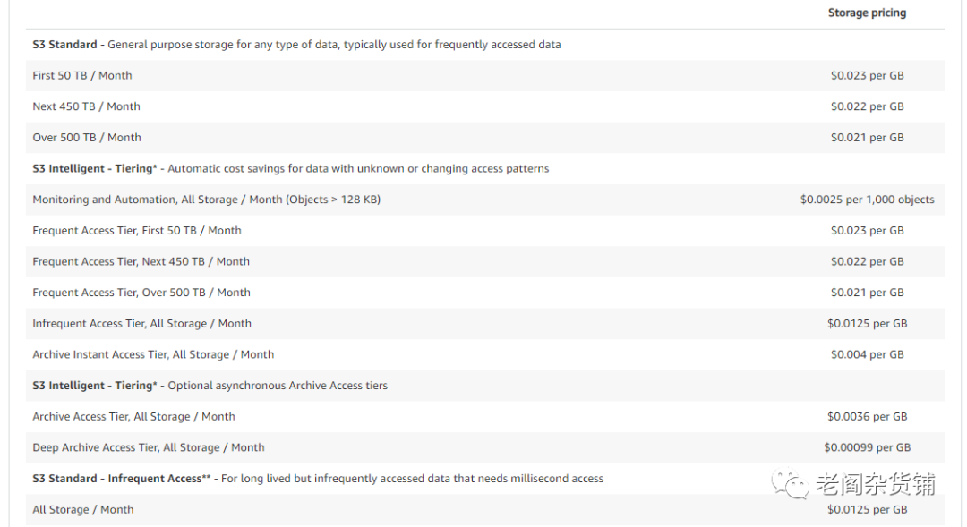 如果数据使用的场景不是很固定,数据被集成后存储的最低成本的目的地是对象存储。如下是AWS S3存储的报价: