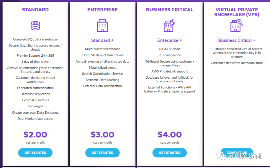 作为最为普及的云数据仓库,snowflake已经被非常多的企业客户所采纳。Snowflake支持将对象存储作为外部存储去访问对象中的数据,并且进行数据的查询和分析。下面我们来看看Snowflake的价格: