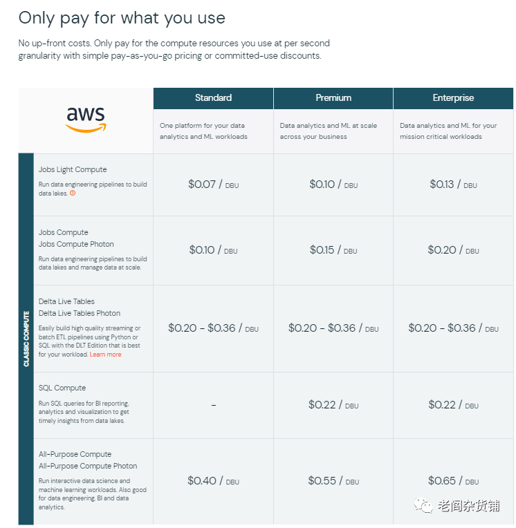 Databricks作为湖仓一体提供商,可以非常方便的访问对象存储中的数据并且完成数据的处理和计算。而且因为技术实现原理的不同,Databricks相对于snowflake,能够处理数据的能力更强。对于很多SQL不方便处理的数据,Databricks都可以比较轻松的通过python来实现。作为snowflake的竞争对手,databricks采用了DBU(Databricks Unit)来进行价格计算。价格表如下: