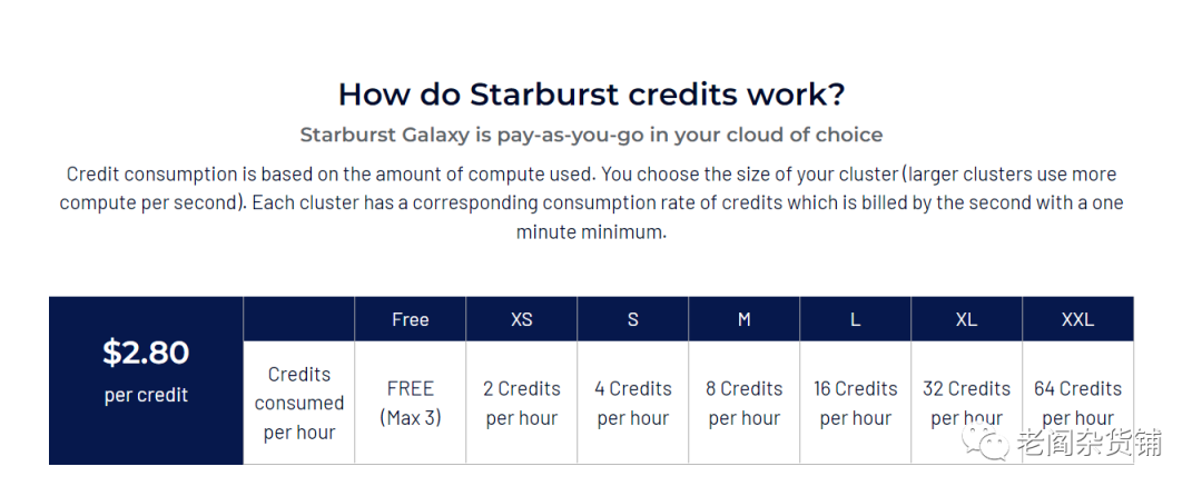 Starburst是开源项目Trino的商业化公司,支持跨多种数据源的数据计算和访问,因此可以非常好的访问在对象存储上的数据并完成数据处理和计算。Starburst也是采用了类似于Snowflake的计价方式,采用credit进行价格计量。