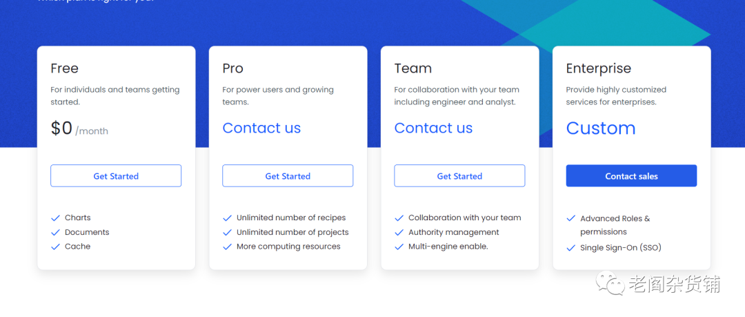 QuickTable是一个基于表格进行数据转换和建模的平台。不同于其他的数据建模工具,QuickTable本身包括一个内存引擎,可以直接从对象存储中读取数据,在自己的内存中进行数据的处理和计算。对于百万行级别,1G以内的数据,QuickTable可以实现交互式的操作。因此对于数据规模不大,但是很多数据探索式的加工,QuickTable是个非常不错的选择。由于QuickTable是个无代码平台,因此用户不需要写SQL和python代码就能完成数据处理计算。不同于前面提到的几个数据仓库平台,QuickTable的收费模式采用的是按照席位进行收费,如下图: