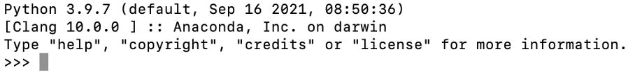 以Mac为例,在Anaconda安装完成后,打开终端,输入python,打开Python控制台,也就是Python的交互模式,Python提示符为>>>,之后可输入命令行。输入python后,你可以看到类似下面的内容: