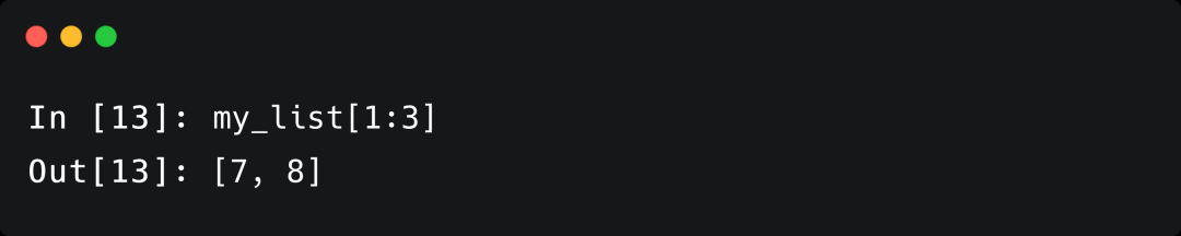 这里,1:3代表一个切片,从元素1(包括)到元素3(不包括),从而得到一个子列表包含原列表中第二和第三个元素。