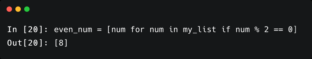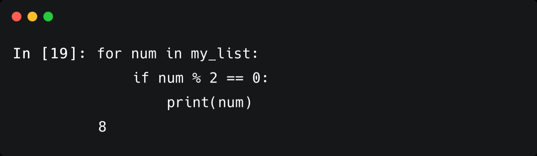 有时我们需要根据某些条件对数据进行处理。比如我们需要显示列表中的偶数,我们可以输入如下的代码: