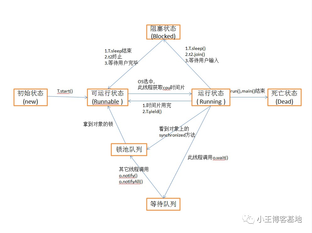 ms)或t.join()方法,或者发出了I/O请求时,JVM会把该线程置为阻塞状态。当sleep()状态超时、join()等待线程终止或者超时、或者I/O处理完毕时,线程重新转入可运行(runnable)状态。