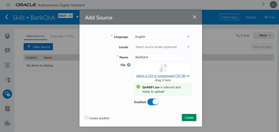 输入:Name,并拖入准备的QnA资源文件,点击“Create”。