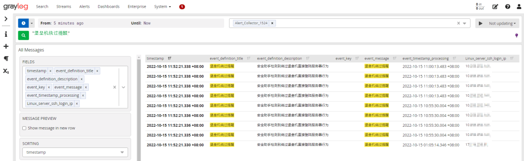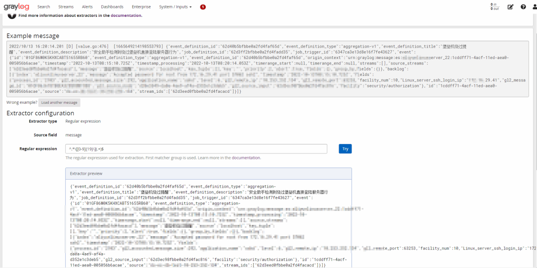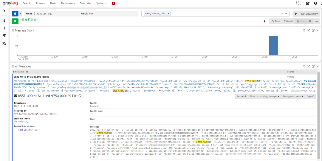 2022/10/14 14:15:15.735 [D] [value.go:476] [1665728115735353131] {"event_definition_id":"62d40b5bfbbe0a2fd4faf65d","event_definition_type":"aggregation-v1","event_definition_title":"堡垒机绕过提醒","event_definition_description":"安全助手检测到绕过堡垒机直接登陆服务器行为","job_definition_id":"62d3ff2bfbbe0a2fd4fadd35","job_trigger_id":"6348fe7213d8e16f7fe61732","event":{"id":"01GFAJ3W0SZSGJNTK01QKMRQXB","event_definition_type":"aggregation-v1","event_definition_id":"62d40b5bfbbe0a2fd4faf65d","origin_context":"urn:graylog:message:es:linuxserver_23:e6490781-4b86-11ed-aea0-005056b6acae","timestamp":"2022-10-14T06:10:46.428Z","timestamp_processing":"2022-10-14T06:15:14.713Z","timerange_start":null,"timerange_end":null,"streams":[],"source_streams":["62d3eed0fbbe0a2fd4facacd"],"message":"堡垒机绕过提醒","source":"localhost","key_tuple":[],"key":"","priority":2,"alert":true,"fields":{},"group_by_fields":{}},"backlog":[{"index":"linuxserver_23","message":"Accepted password for root from 192.168.29.41 port 60382 ssh2","timestamp":"2022-10-14T06:10:46.428Z","fields":{"process_id":"3194","gl2_accounted_message_size":292,"application_name":"sshd","level":6,"gl2_remote_ip":"172.16.252.134","gl2_remote_port":64781,"facility_num":10,"Linux_server_ssh_login_ip":"192.168.29.41","gl2_message_id":"01GFAHV3ZRYPS0G895J23348A6","gl2_source_node":"d20e3549-da0a-4ae9-af4a-d352e1c3deb5","gl2_source_input":"62d3ec98fbbe0a2fd4fac816","facility":"security/authorization"},"id":"e6490781-4b86-11ed-aea0-005056b6acae","source":"ec-server-test-172-16-252-134","stream_ids":["62d3eed0fbbe0a2fd4facacd"]}]}