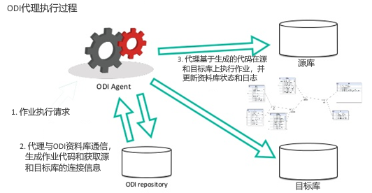 在E-LT体系结构中,该代理可以与目标数据库位于同一服务器上,从而在通过JDBC传输数据时减少网络节点的数目,比如可以安装部署在Exadata上,用于数据仓库的集中和转换,提升数据加载的效率;