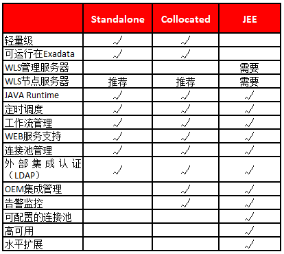 经过上面的介绍,我们已经对ODI的代理有了初步了解。下图总结了3种不同代理之间的功能差异,可根据项目需求、部署的环境进行相应的选择。