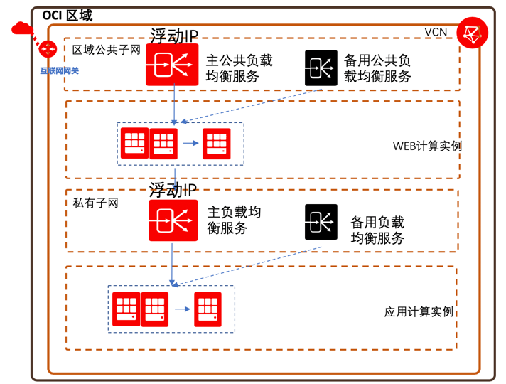 为实现负载均衡器的高可用性,OCI为每个负载均衡服务自动配置主负载均衡服务和备用负载均衡服务,并且会为它们分配一个浮动IP地址。当主负载均衡服务发生故障时,浮动IP地址将自动切换到备用负载均衡服务。
