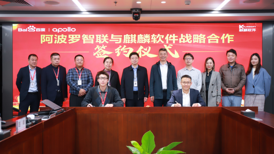 10月24日,阿波罗智联(北京)科技有限公司(下称“阿波罗智联”)与麒麟软件有限公司(下称“麒麟软件”)战略合作协议签约仪式在北京举行。在百度智能驾驶事业群副总裁刘常康和麒麟软件高级副总经理韩乃平共同见证下,百度车路协同首席科学家王淼和麒麟软件嵌入式操作系统负责人吴春光代表双方签订了战略合作协议。双方将围绕智能网联操作系统关键技术创新、产业链及生态建设、标准制定、社区开源等多个领域开展深入合作,共同打造国产智能网联操作系统并开展系统验证与示范应用。