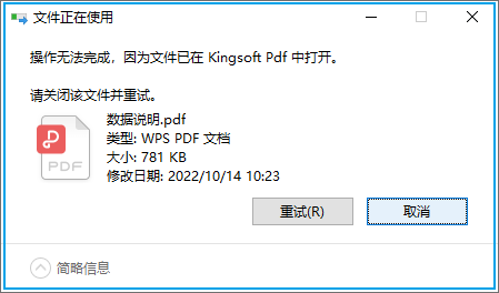 这里演示的是 pdf 文件被进程占用的情况,在提示框中可以知道是被 “Kingsoft Pdf" 占用。在现实环境中这里可能并不会显示有用的程序名。我们此时需要定位到进程ID,必要时通过进程ID杀掉进程来解除资源占用。