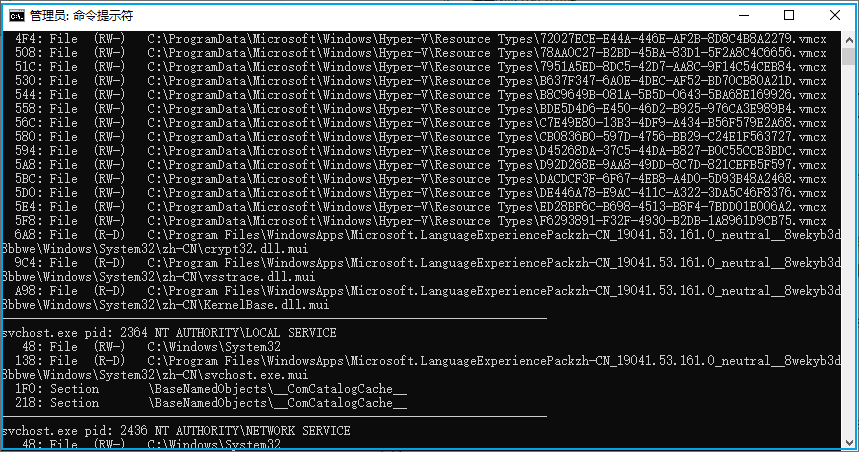 使用 handle 可以对文件和目录进行检索,查看文件或目录被哪个进程占用,使用方法是在 handle 命令后面接文件名或目录的绝对路径: