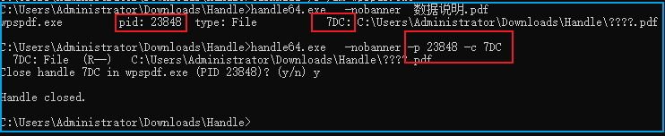除了使用 taskkill 杀进程,也可以使用 handle 程序杀掉占用文件的句柄,其中要用到进程ID和句柄号(16进制)。