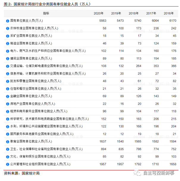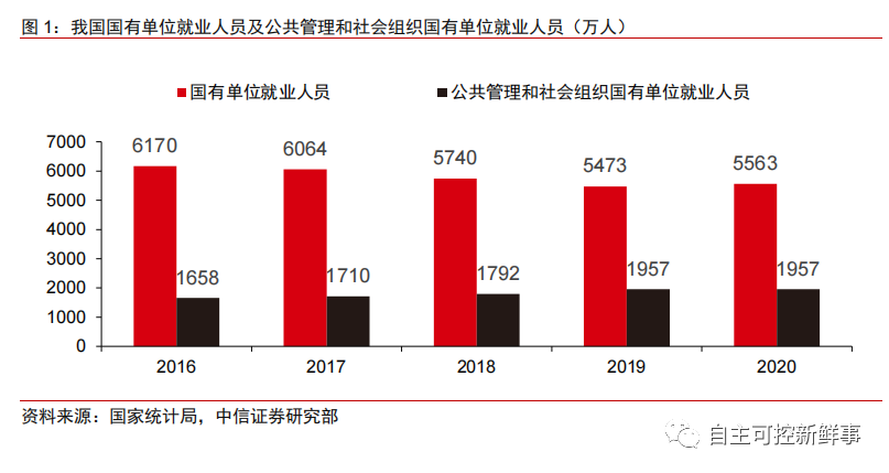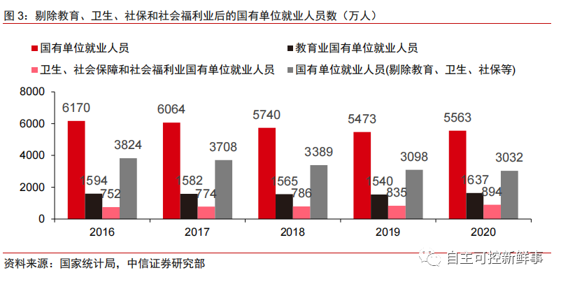 2)大口径5563万人:政府机关+事业单位(含教育、卫生等,不含央国企。)根据国家统计局,2020年我国国有单位就业人员共5563万人,此口径以政府机关、事业单位为主。