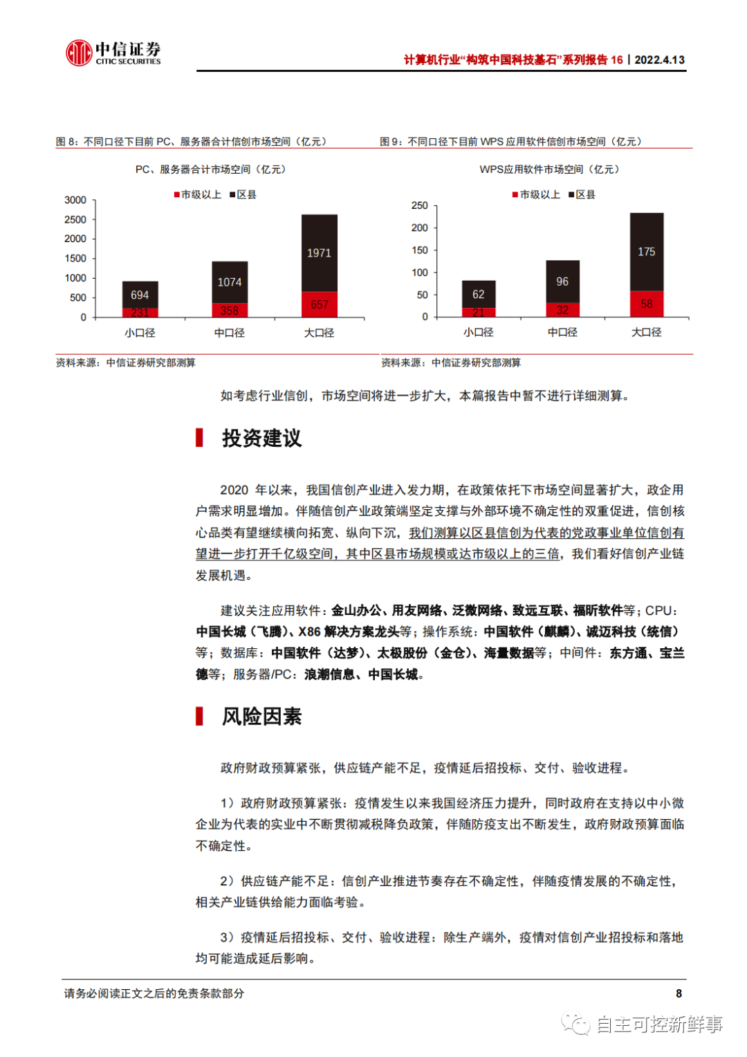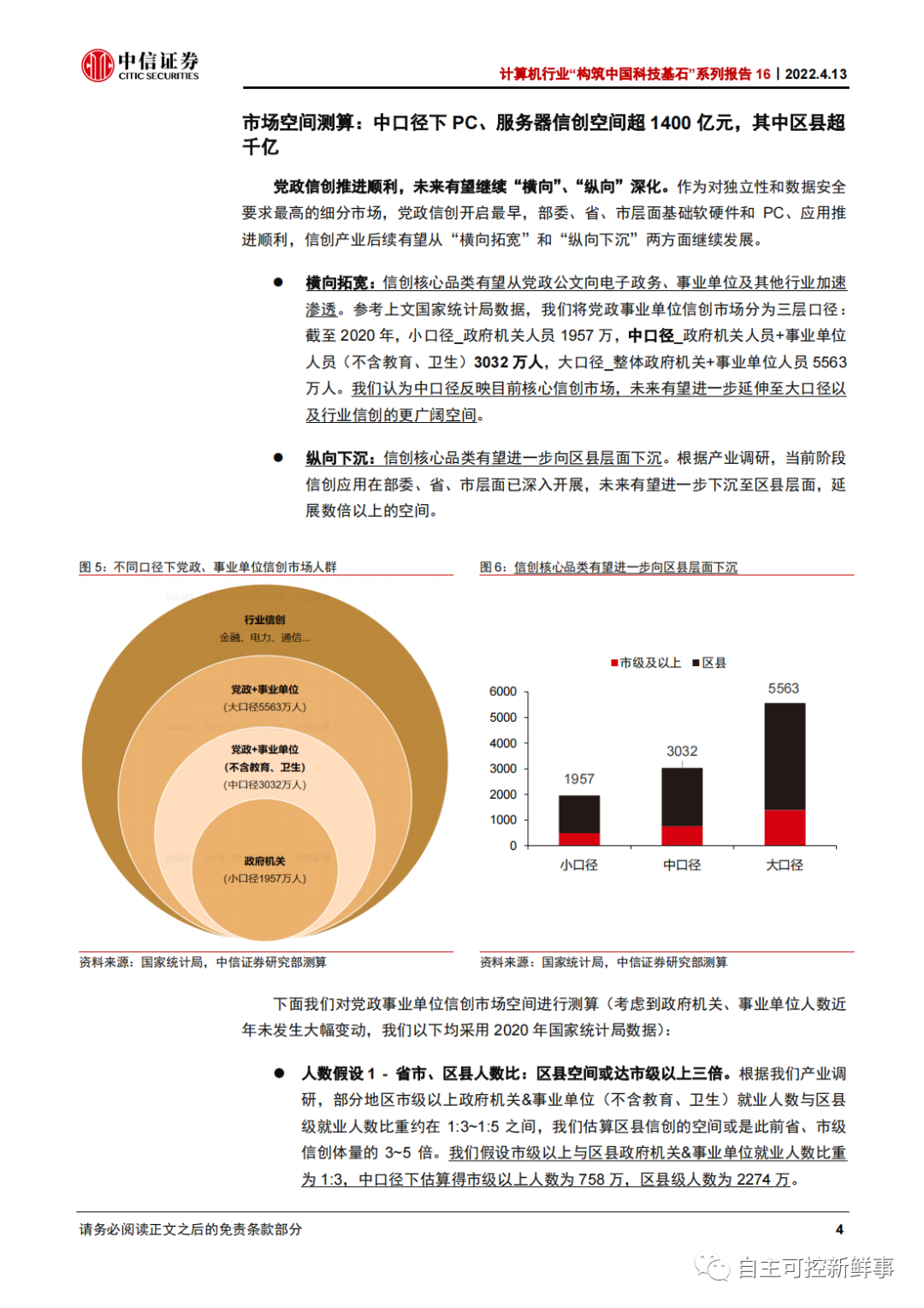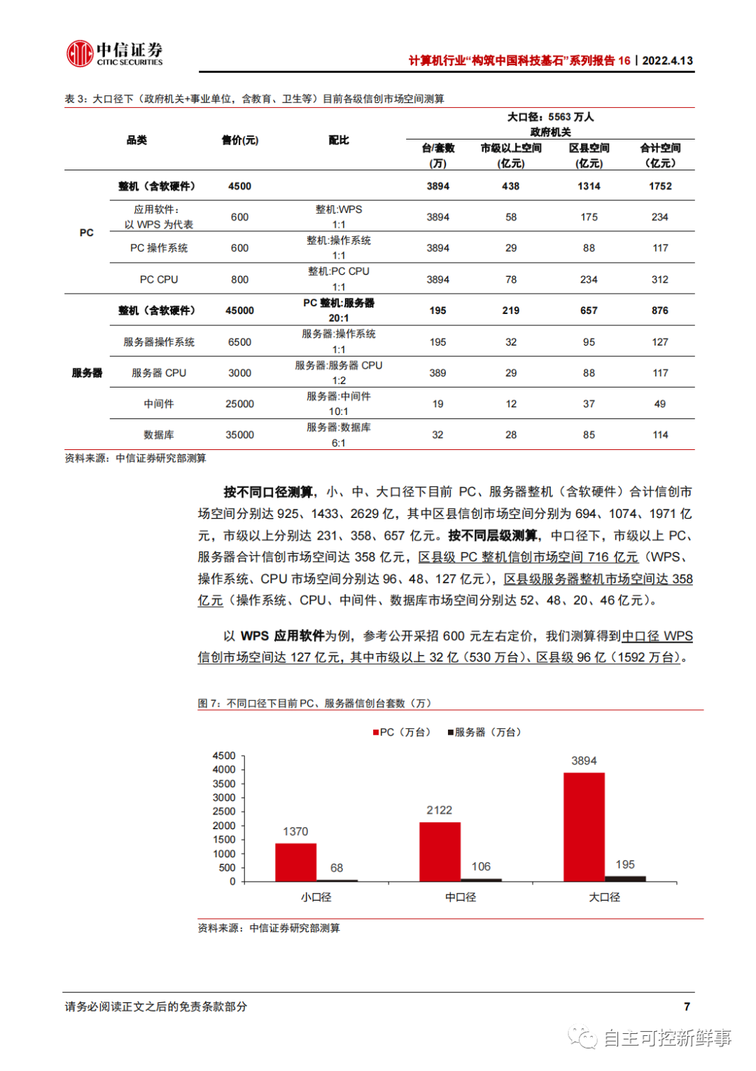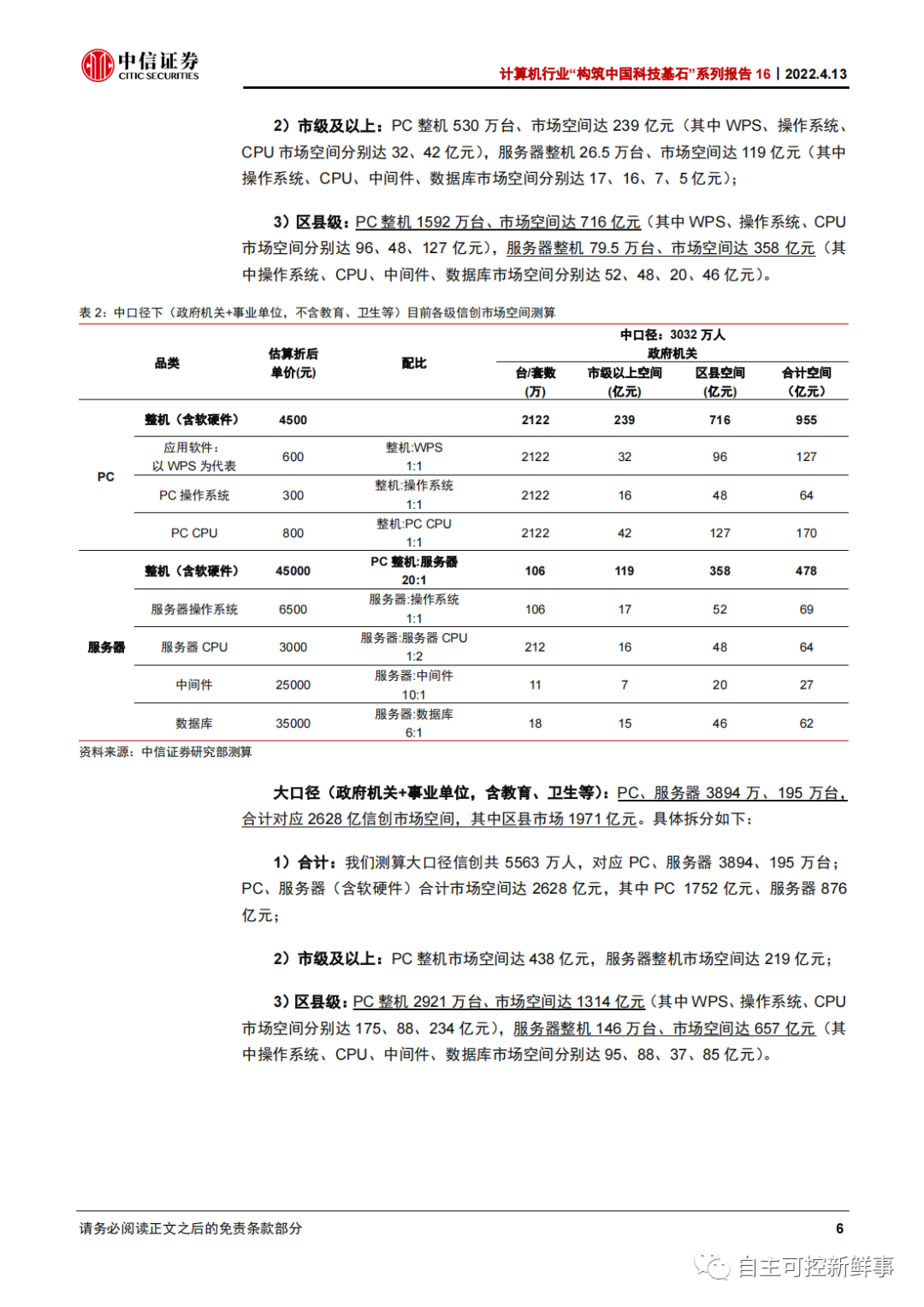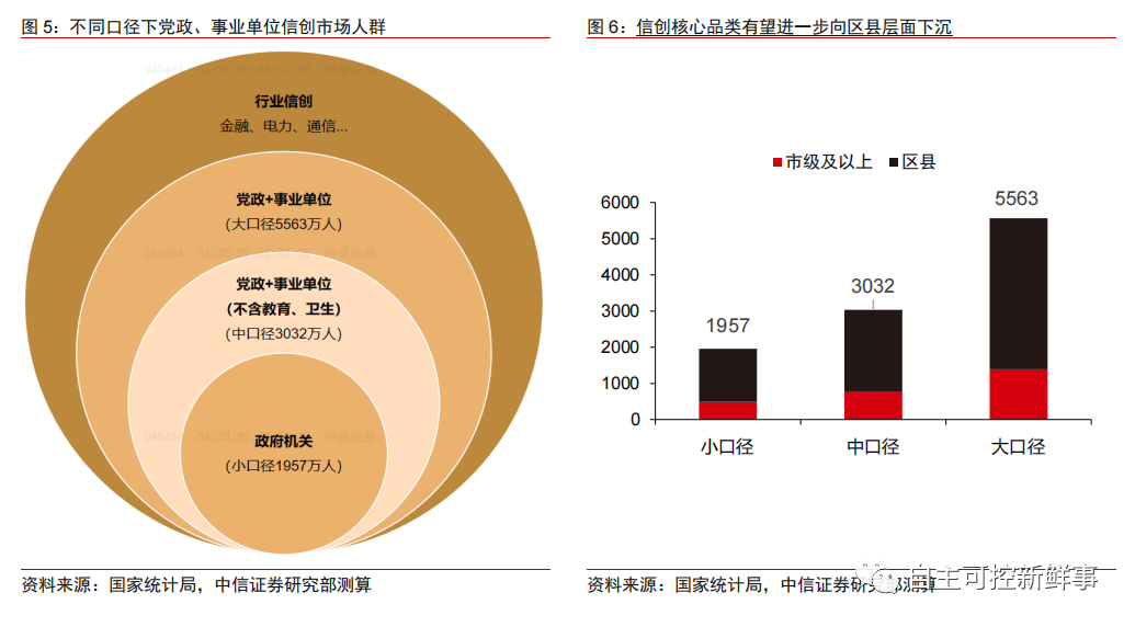 大口径(政府机关+事业单位,含教育、卫生等):PC、服务器 3894 万、195 万台,合计对应 2628 亿信创市场空间,其中区县市场 1971 亿元。