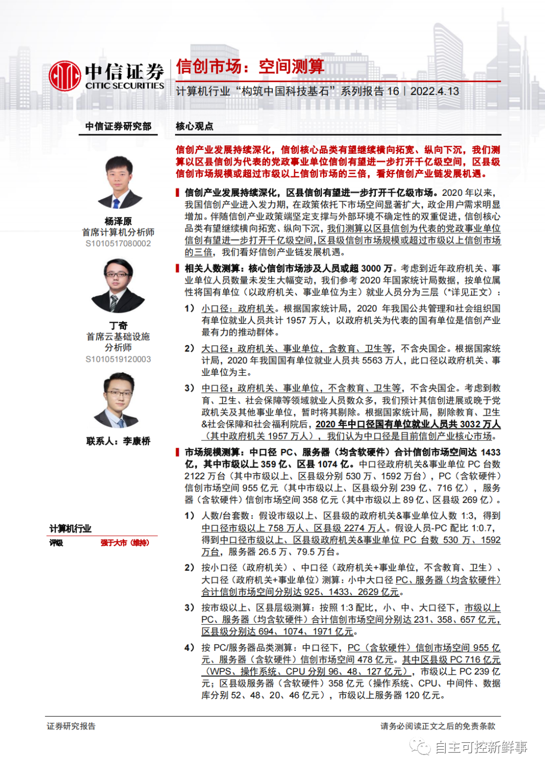 1)合计:我们测算大口径信创共 5563 万人,对应 PC、服务器 3894、195 万台;PC、服务器(含软硬件)合计市场空间达 2628 亿元,其中 PC 1752 亿元、服务器 876亿元;