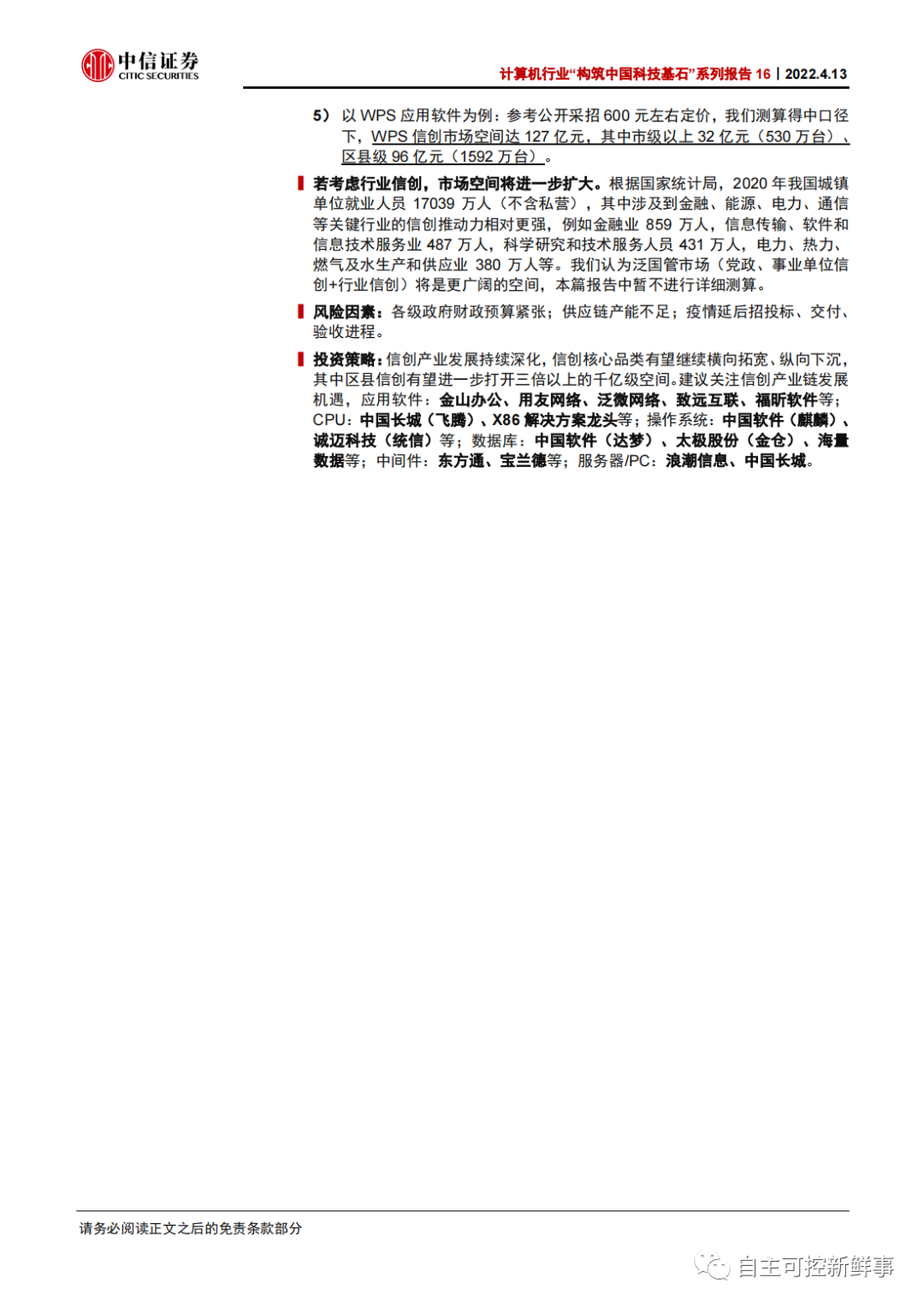 信创产业发展持续深化,信创核心品类有望继续横向拓宽、纵向下沉,我们测算以区县信创为代表的党政事业单位信创有望进一步打开千亿级空间,区县级信创市场规模或超过市级以上信创市场的三倍,看好信创产业链发展机遇。