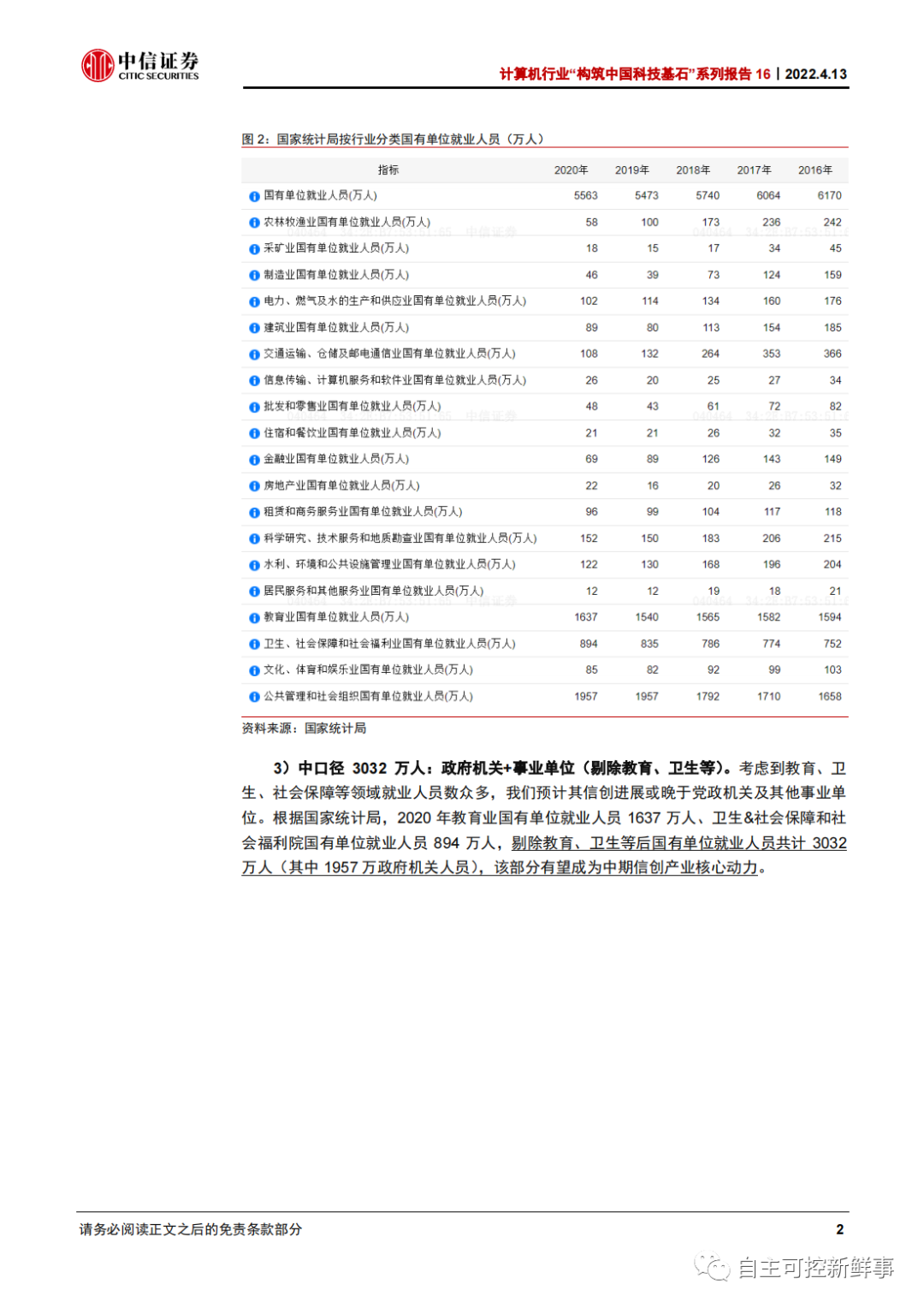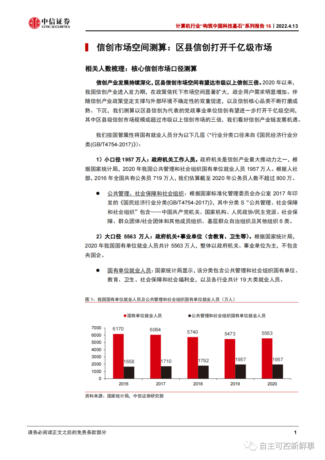 1)小口径1957万人:政府机关工作人员。以政府机关为代表的国有单位是信创产业最有力的推动群体。根据国家统计局,2020 年我国公共管理和社会组织国有单位就业人员 1957 万人。根据人社部,2016 年全国共有公务员 719 万人,我们估算截至 2020 年公务员人数不超过 800 万。