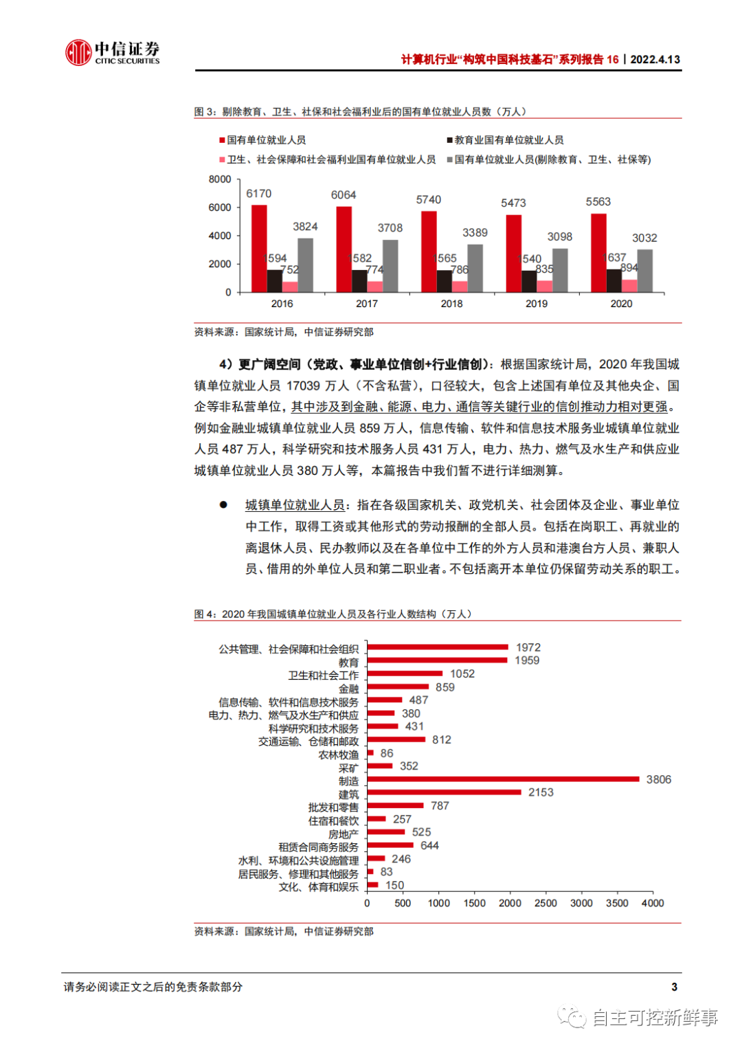 3)中口径3032万人:政府机关+事业单位(剔除教育、卫生等,不含央国企。)考虑到教育、卫生、社会保障等领域就业人员数众多,我们预计其信创进展或晚于党政机关及其他事业单位,暂时将其剔除。根据国家统计局,2020 年教育业国有单位就业人员 1637 万人、卫生&社会保障和社会福利院国有单位就业人员 894 万人,剔除教育、卫生&社会保障和社会福利院后,2020年中口径国有单位就业人员共3032万人(其中政府机关1957万人),我们认为中口径部分有望成为中期信创产业核心动力。