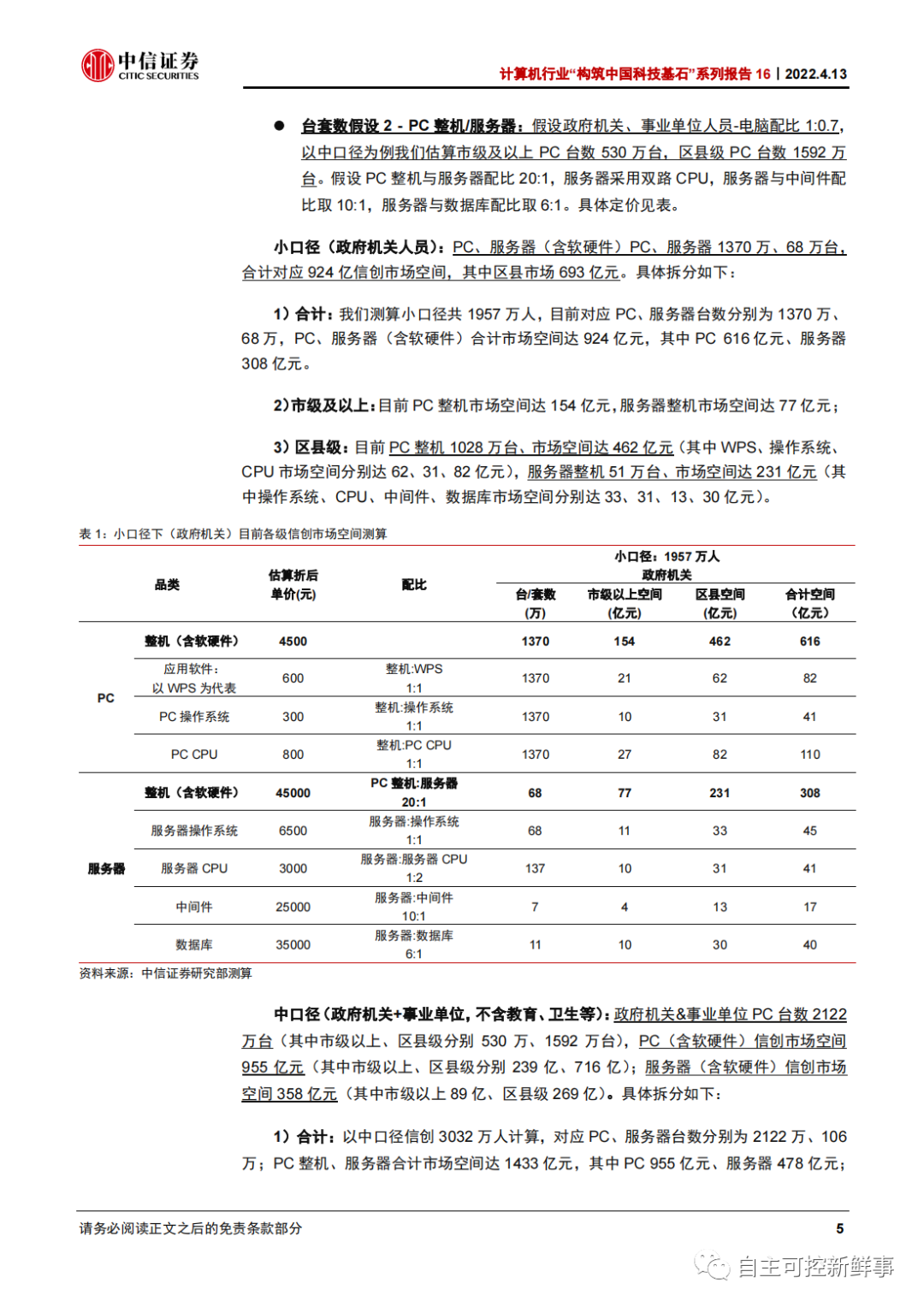 中口径(政府机关+事业单位,不含教育、卫生等):政府机关&事业单位 PC 台数 2122万台(其中市级以上、区县级分别 530 万、1592 万台),PC(含软硬件)信创市场空间955 亿元(其中市级以上、区县级分别 239 亿、716 亿);服务器(含软硬件)信创市场空间 358 亿元(其中市级以上 89 亿、区县级 269 亿)。