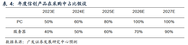 (3) 考虑到正常情况下IT软硬件生命周期多为5年,同时以PC终端为主的办公系统与一般业务系统信创推进较快,服务器占比较高的生产制造研发系统信创推进相对较慢,我们假设23-27年政府与关基行业PC与服务器采购中信创产品占比如下:
