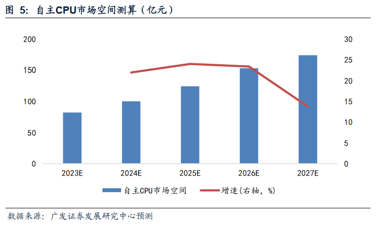 23-27年自主CPU市场空间分别为82亿、100亿、124亿、153亿、174亿元