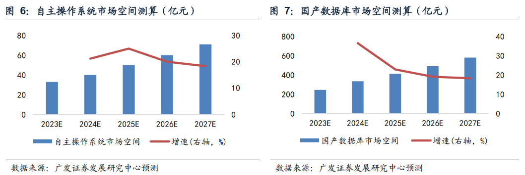 采用“自主CPU”一节中对于行业信创PC与服务器存量数量、替换节奏的假设,并假设桌面端OS与服务器OS的平均单价分别为300元、6500元。计算出23-27年自主操作系统市场空间分别为33亿、40亿、50亿、60亿、71亿元。
